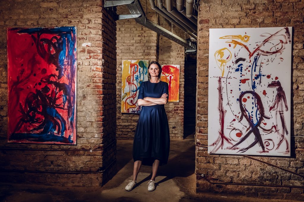 Ihre Arbeit entsteht nicht im Atelier sondern aus ihrem Leben heraus an dem Ort und in der Umgebung in der sich ihre Bilder in ihr finden, setzen, bündeln und dann in erruptiver und teilweise ekstatischer Aktion auf die Lein wände fließen.